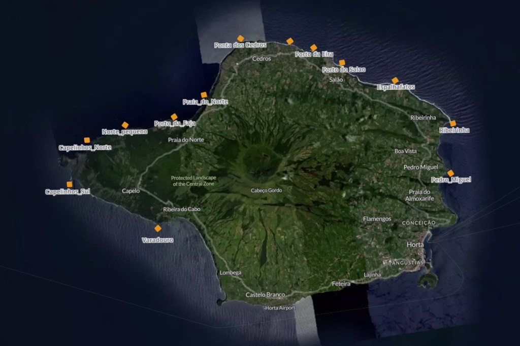 Fig. 1 : Distribution of the aeral survey sampling stations around the island of Faial with the purpose to study the seasonal abundance and densities of smooth hammerhead (S. zygaena).
