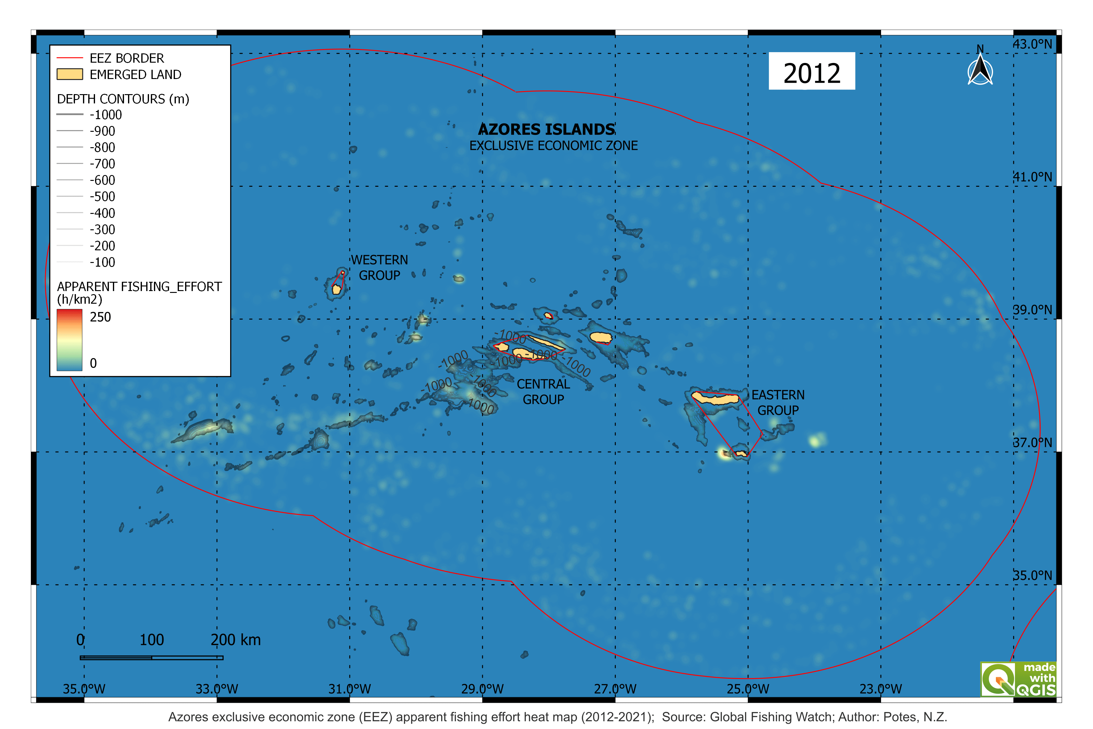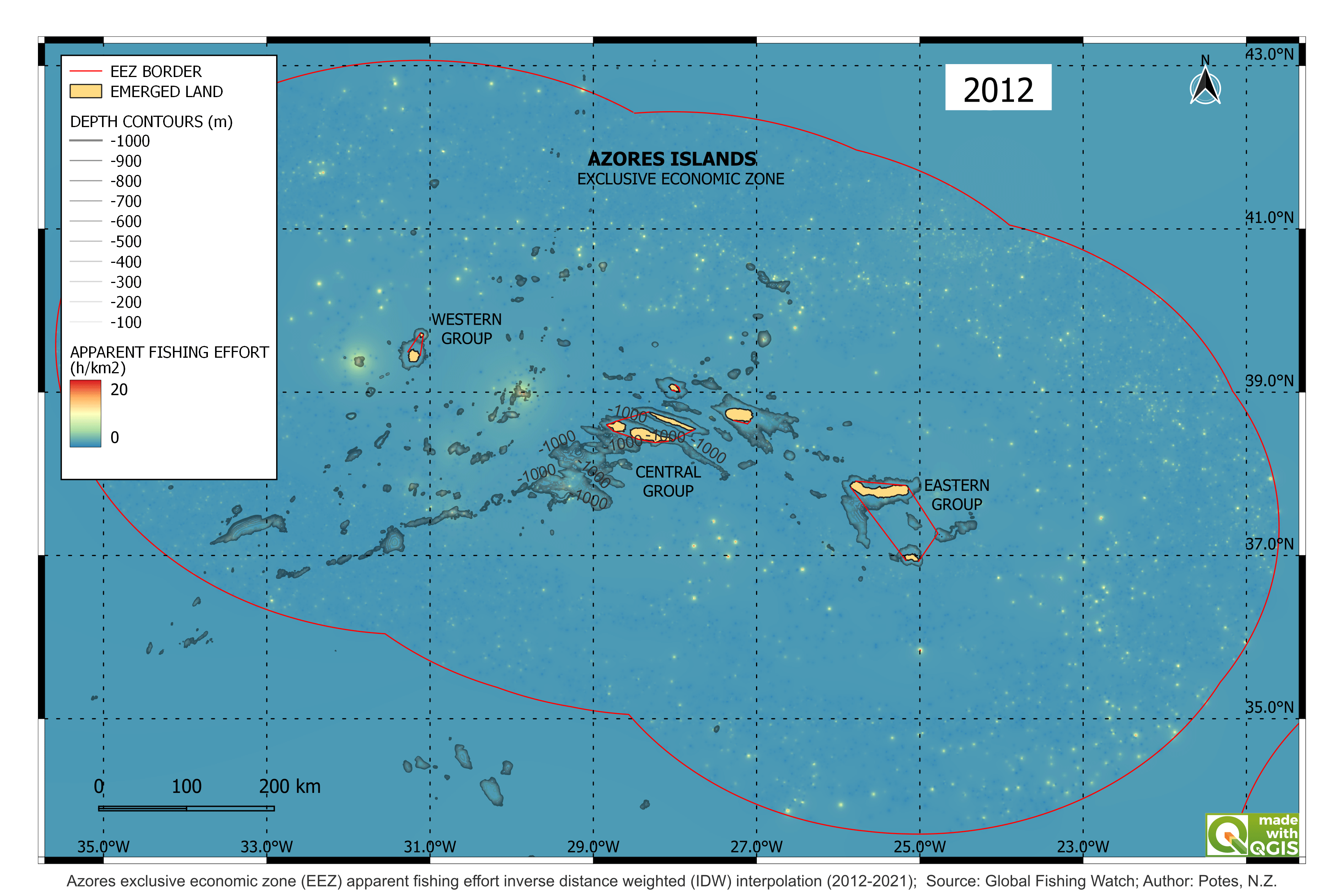 Fig. 1 & 2 : Seing the Azores exclusive economic zone (EEZ) as bottom layer, evidencing the seafloor and seamounts raising above -1000 m depth. you can see a 10 year span timelapse of the fishing effort from boats larger than 15m, derived from satellite radar. (data source: Global Fishing Watch). On the left side an inverse weight interpolation model, showing with lighter color where are the areas more prone to recieve fishing vessels considering the past fishing patterns. On the right side, the apparent fishing effort heat map which shows exactly where the fishing effort occours, having a heat colour gradient as reference for the intensity of the fishing activities per square kilometre (h/km2)
