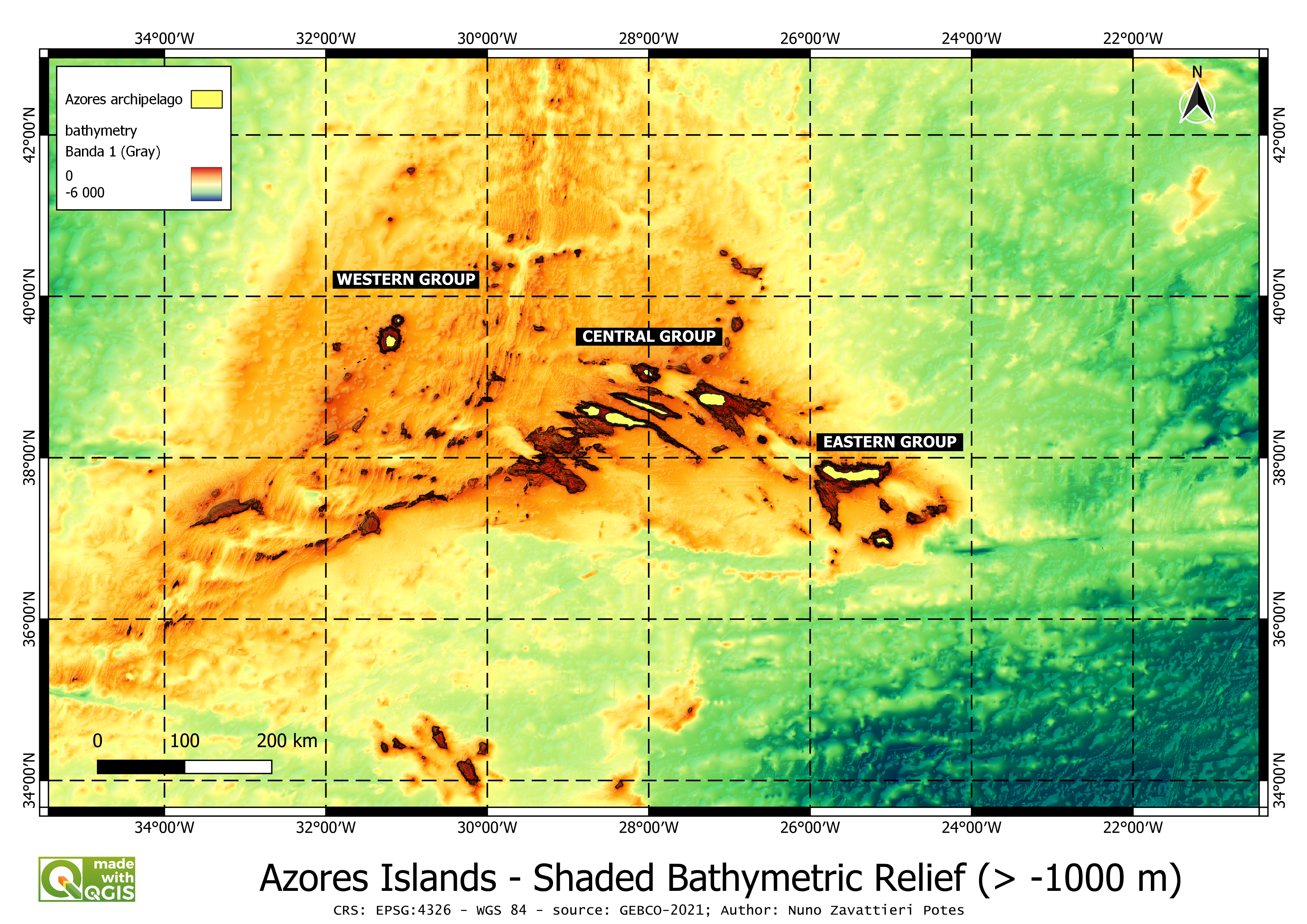 Fig. 3 : The Azores exclusive economic zone (EEZ) evidencing the bathymetric relief (‘seafloor topography’) and its seamounts raising above -1000 m depth. The conspicuos superstructures visible are the mid-atlantic ridge curved on the left half of the map and the Azores Plateau to the east of the ridge occupying the centreal part of the map. The darker red regions evidence the important seamounts (submerged mountains) rising from the ocean floor, sometimes, up to near the surface.